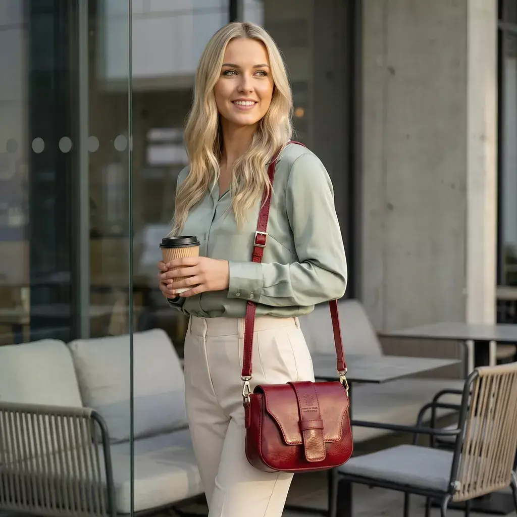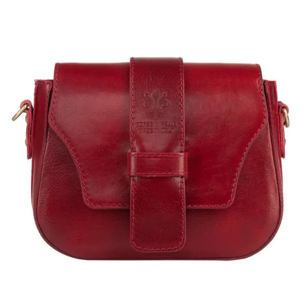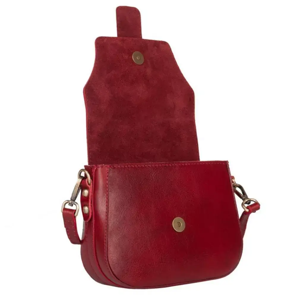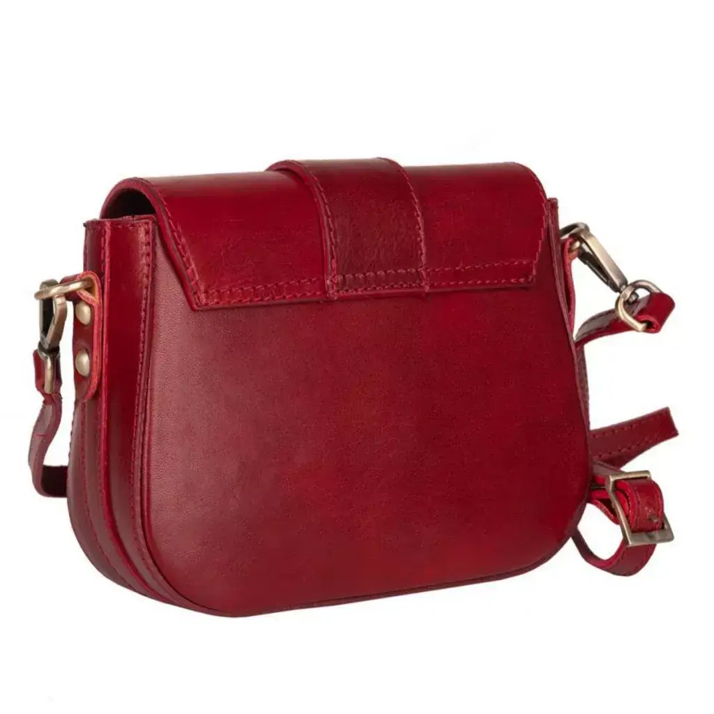 Dámská kožená kabelka z přírodní kůže v červené barvě. Elegantní crossbody s mosaznými doplňky, rozměry (šířka x výška x hloubka) 20,5 × 16,5 × 10 cm. Formát A4 nepojme.