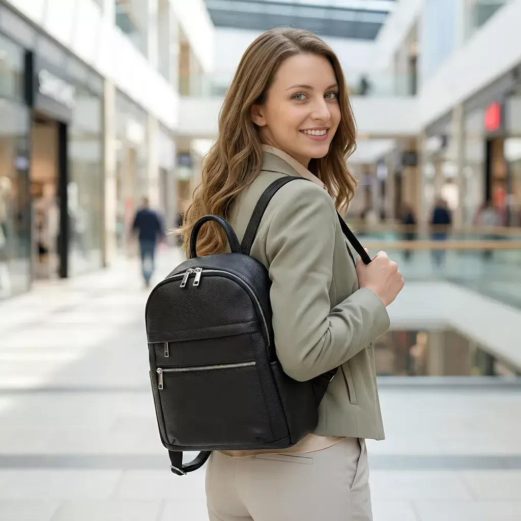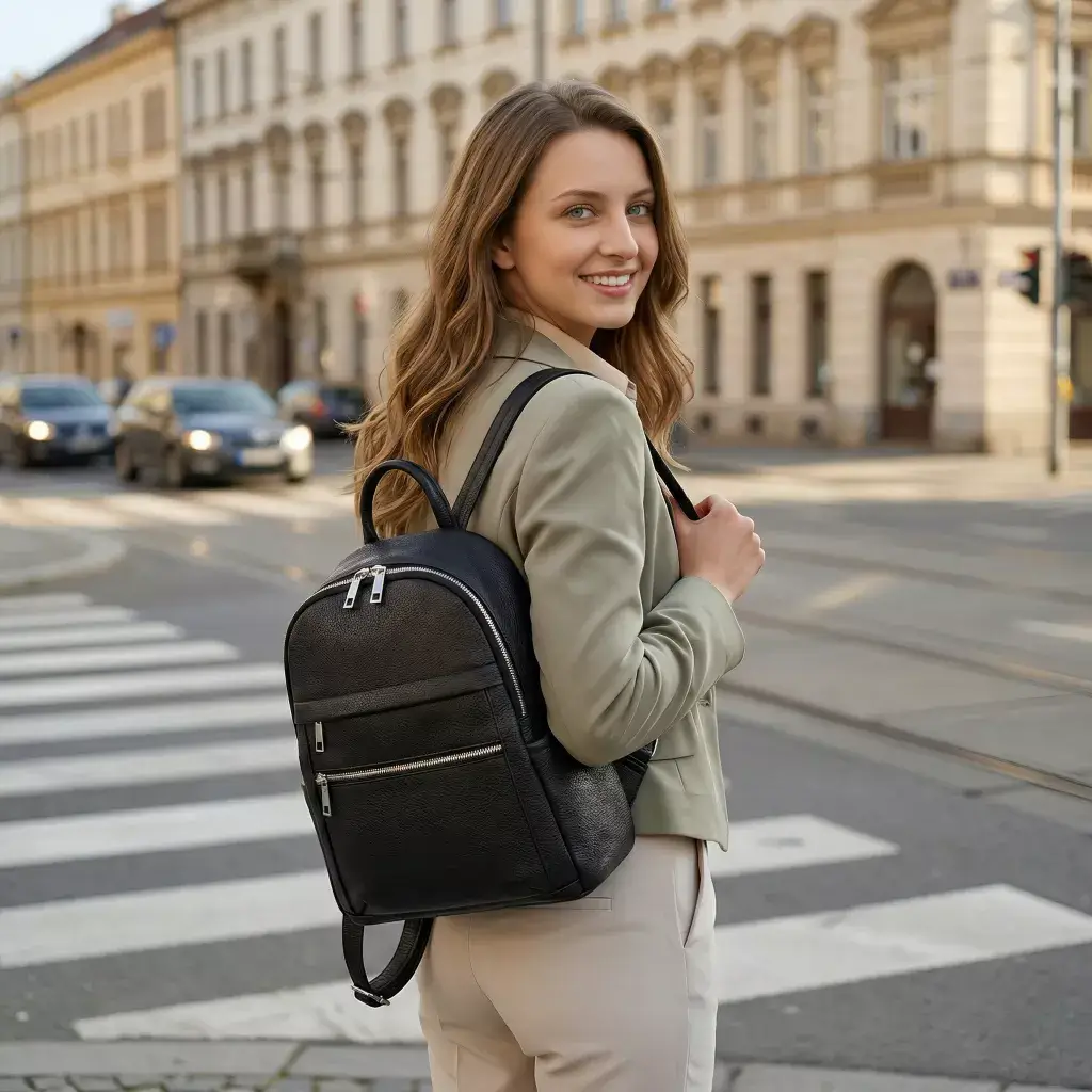 Dámský kožený batoh Elena 332908 je elegantním a praktickým doplňkem pro každodenní nošení. Spojuje moderní design, kvalitní zpracování a vysoký komfort. Vyroben je z prémiové zrnité přírodní kůže Dollaro, která je měkká na dotek, odolná a dlouhodobě drží svůj tvar. Tento model nabízíme v elegantní černé barvě, která dodává outfitu svěží a nadčasový vzhled.