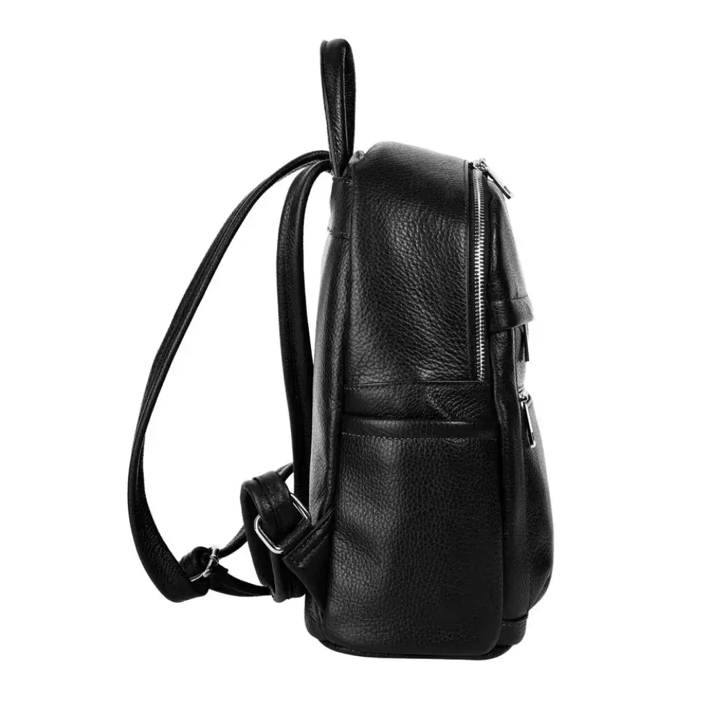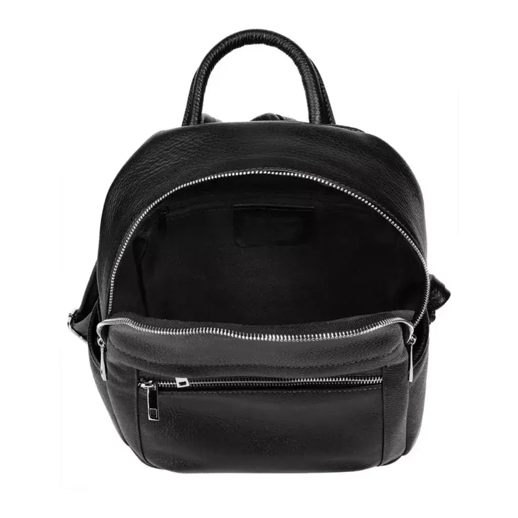 Dámský kožený batoh z přírodní zrnité kůže Dollaro v černé barvě. Elegantní model se stříbrnými doplňky, rozměry 30 × 33 × 13 cm, hmotnost 0,7 kg. Formát A4 nepojme.