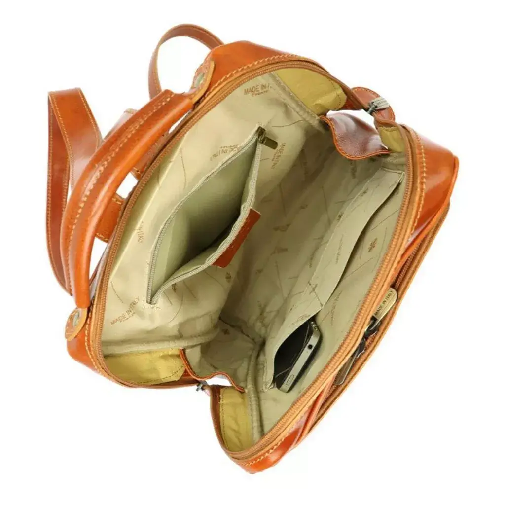 Mosazné kovové doplňky podtrhují elegantní vzhled batohu a dodávají mu luxusní charakter. Celkové provedení je pevné, odolné a připravené na každodenní používání.