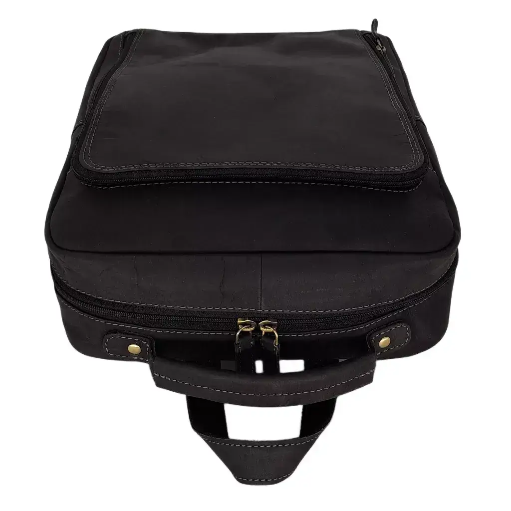 Pánský kožený batoh Tailor 083408 z broušené přírodní kůže v černé barvě. Elegantní městský model s mosaznými doplňky, dvěma komorami na zip a rozměry 28 × 35 × 13 cm. Formát A4 pojme.