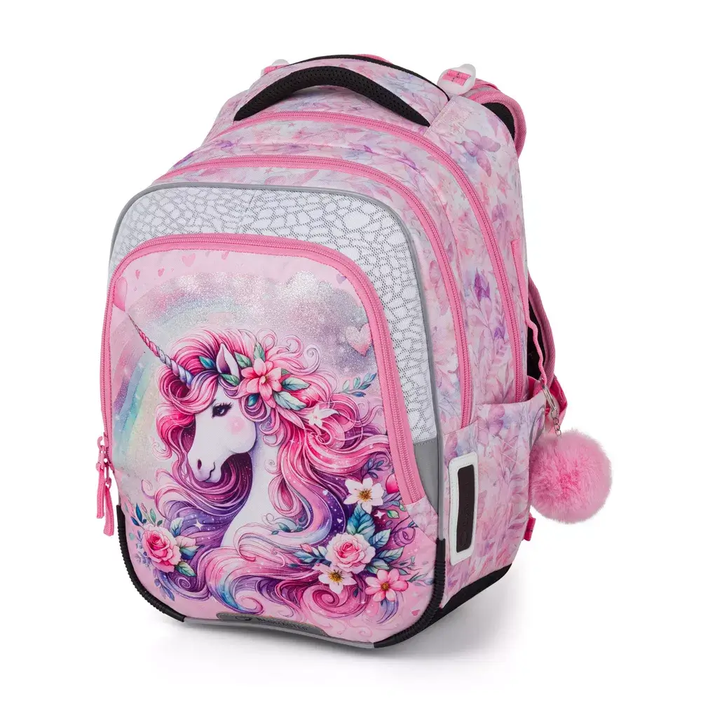 Lehký tříkomorový školní batoh Bagmaster BETA 26 B s motivem jednorožce. Vhodný pro 1.–3. třídu, s anatomickými zády, reflexními prvky, organizérem a hmotností pouhých 0,94 kg.