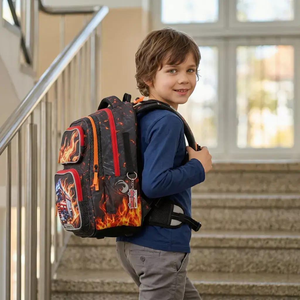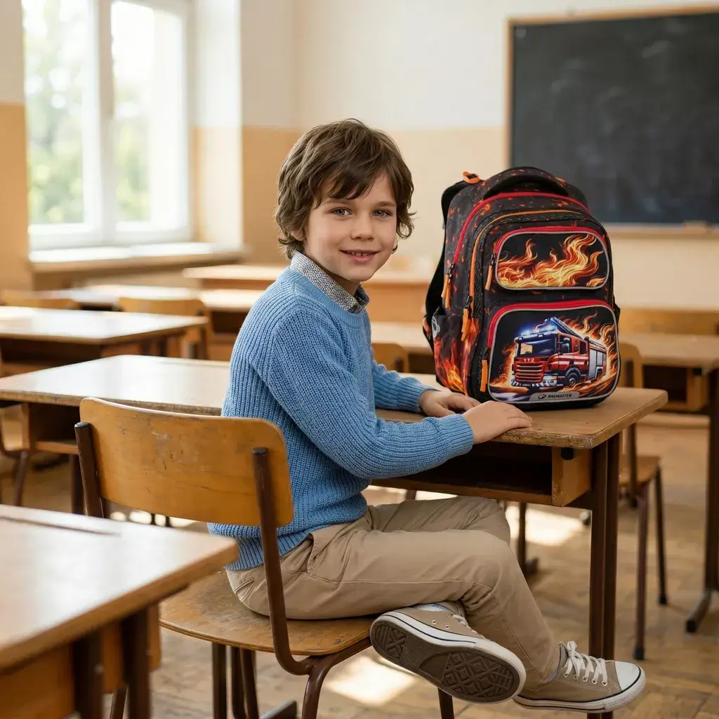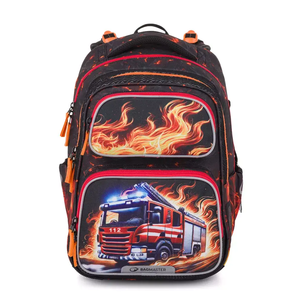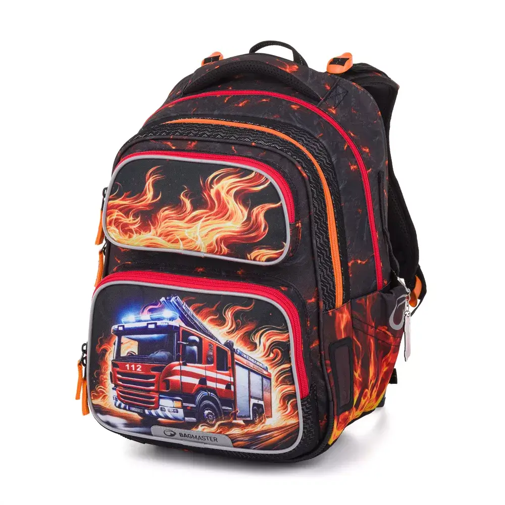 Lehký dvoukomorový školní batoh Bagmaster DOPI 26 A s motivem hasičského auta. Vhodný pro 1.–3. třídu, s ergonomickými zády, reflexními prvky a hmotností pouhých 0,98 kg.