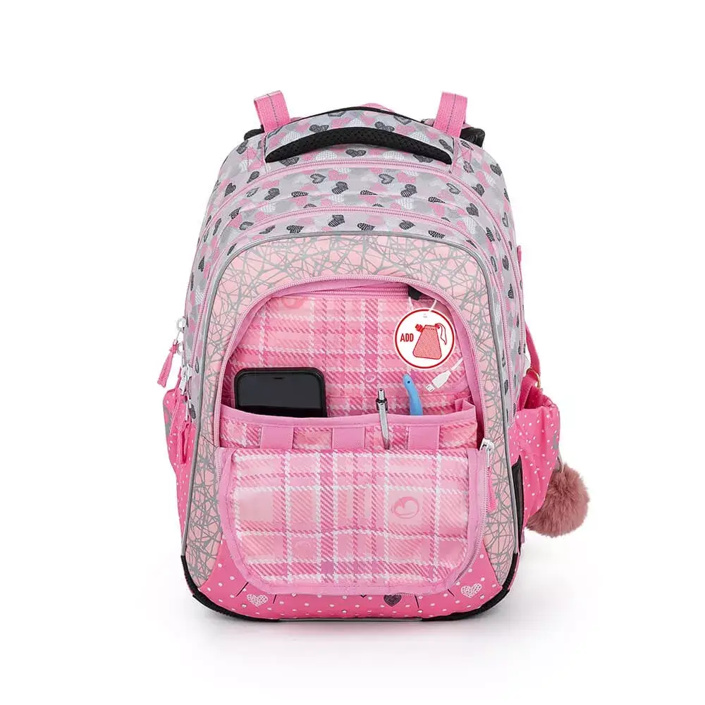 - 3 komory – hlavní komora s kompresní kapsou pro nejtěžší učebnice a desky A4.