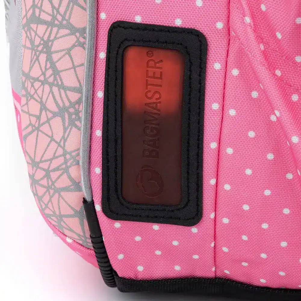 Lehký tříkomorový školní batoh Bagmaster LUMI 22 A s motivem bílé kočky s mašli. Vhodný pro 1.–3. třídu, s ergonomickými zády, reflexními prvky a hmotností pouhých 0,94 kg.