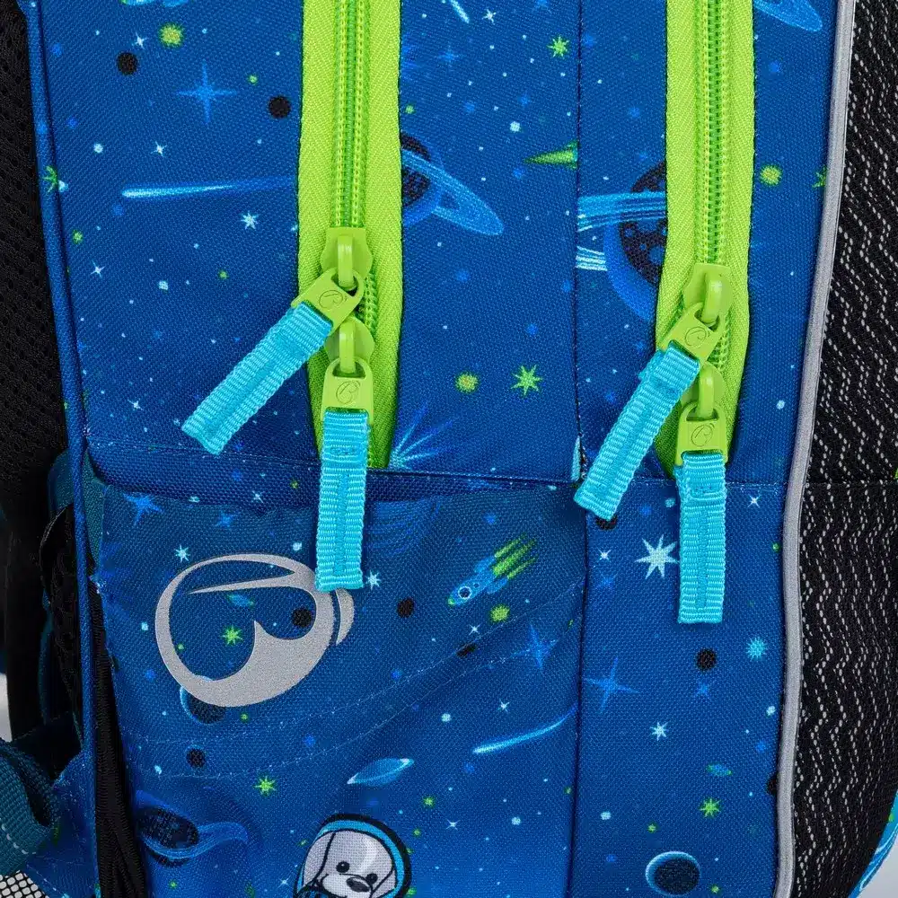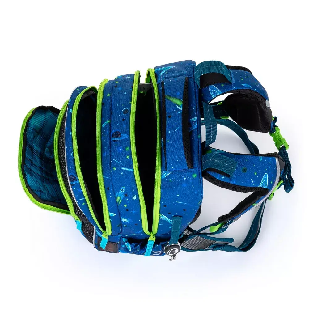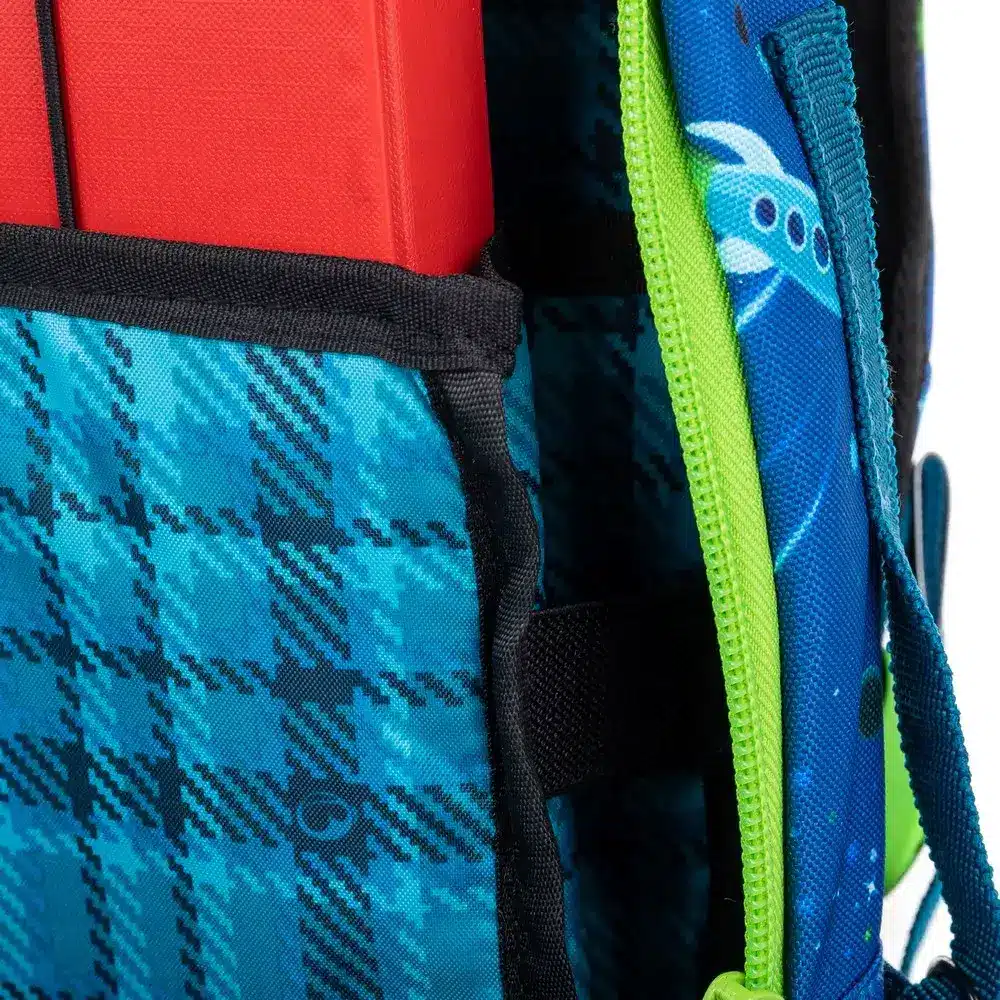 - 3 komory – hlavní komora s kompresní kapsou pro nejtěžší učebnice a desky A4.
