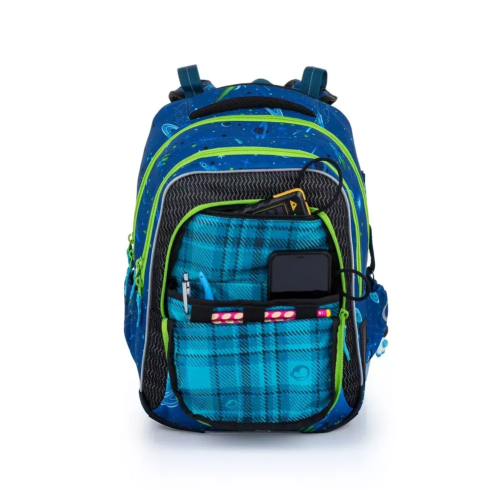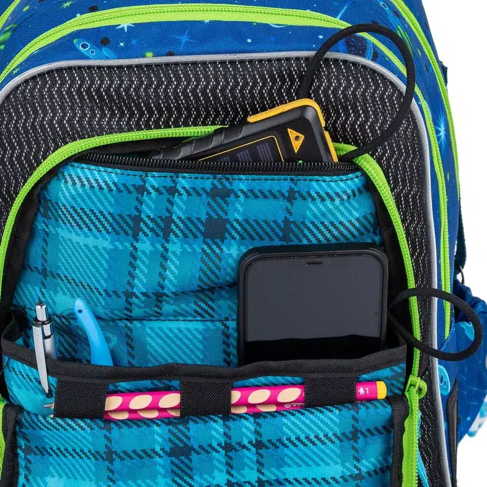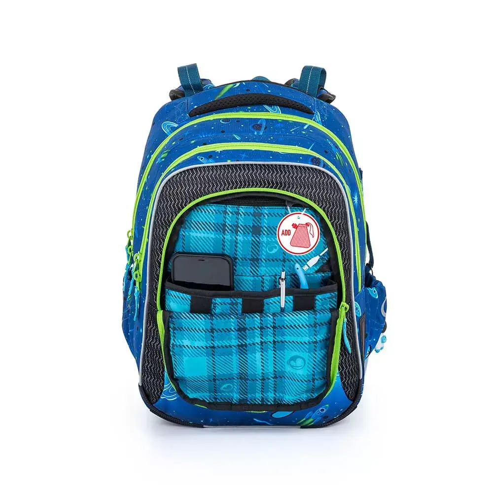 - Přední kapsa s organizérem (mobil, tužky, peněženka, poutko na klíče).