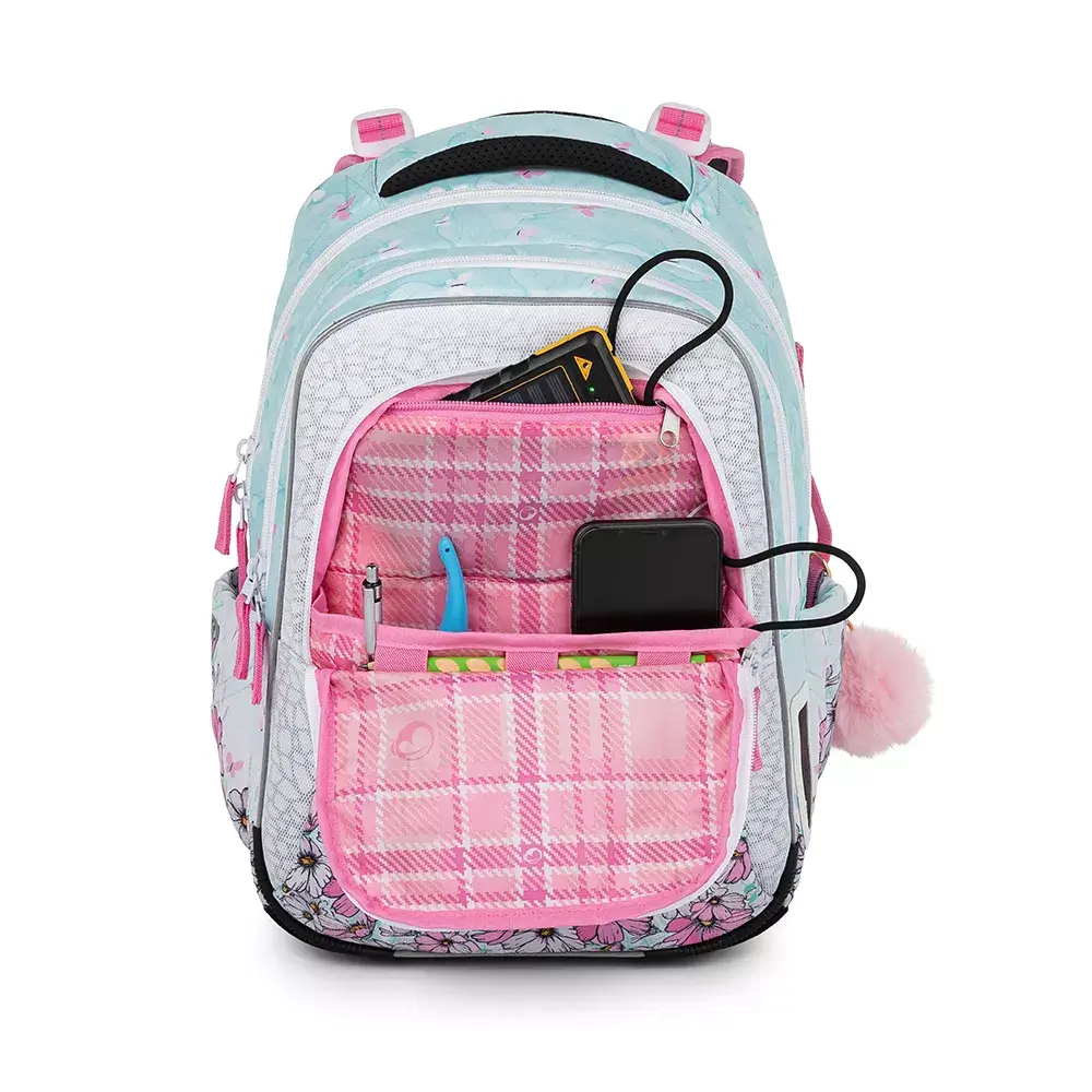 - 3 komory – hlavní komora s kompresní kapsou pro nejtěžší učebnice a desky A4.