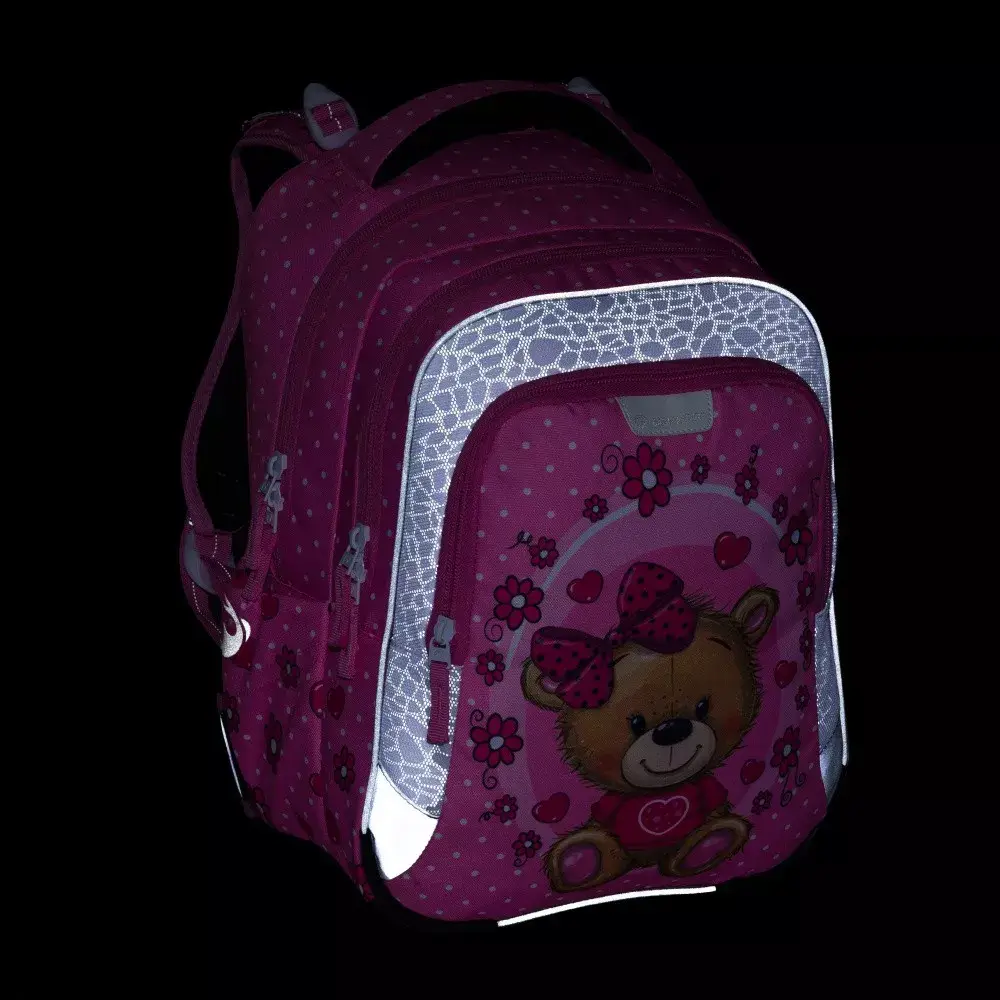 Lehký tříkomorový školní batoh Bagmaster LUMI 24 H s motivem medvídka. Vhodný pro 1.–3. třídu, s ergonomickými zády, reflexními prvky a hmotností pouhých 0,94 kg.
