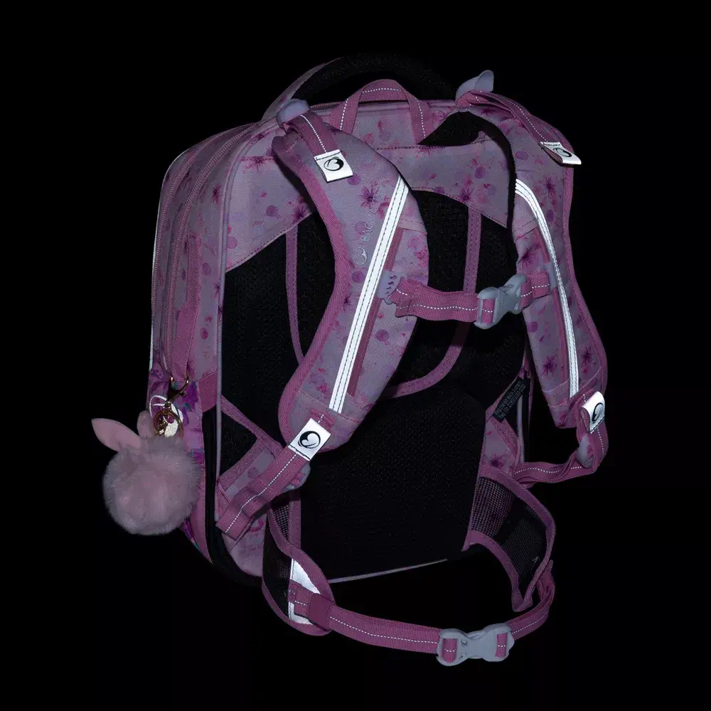 Lehký tříkomorový školní batoh Bagmaster LUMI 25 A s králíčkem. Vhodný pro 1.–3. třídu, s ergonomickými zády, reflexními prvky a hmotností pouhých 0,94 kg.