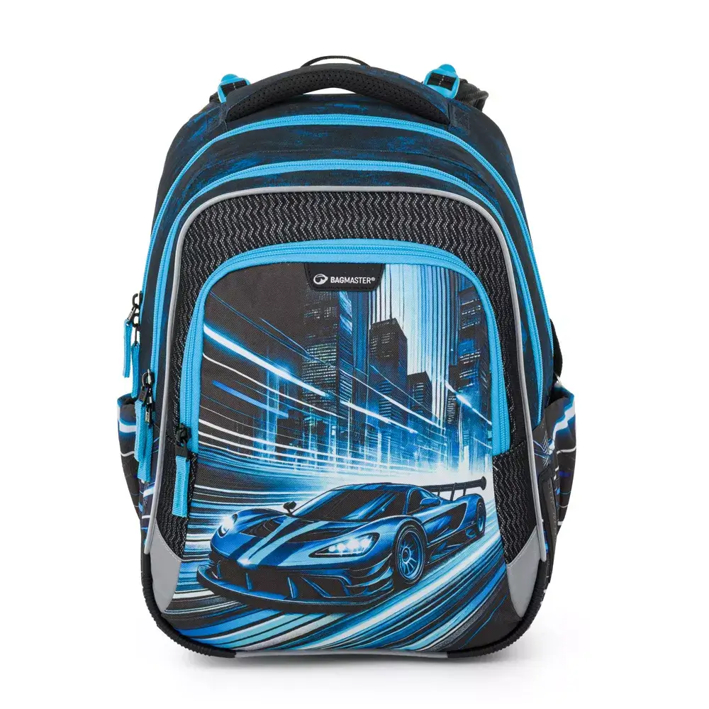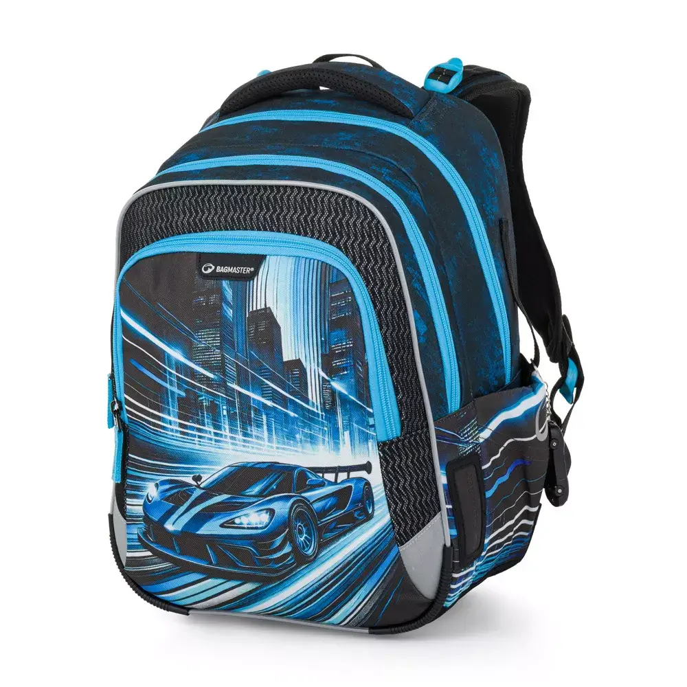 Lehký tříkomorový školní batoh Bagmaster LUMI 26 C s motivem sportovního auta. Vhodný pro děti v 1.–3. třídu, s ergonomickými zády, reflexními prvky a hmotností pouhých 0,94 kg.