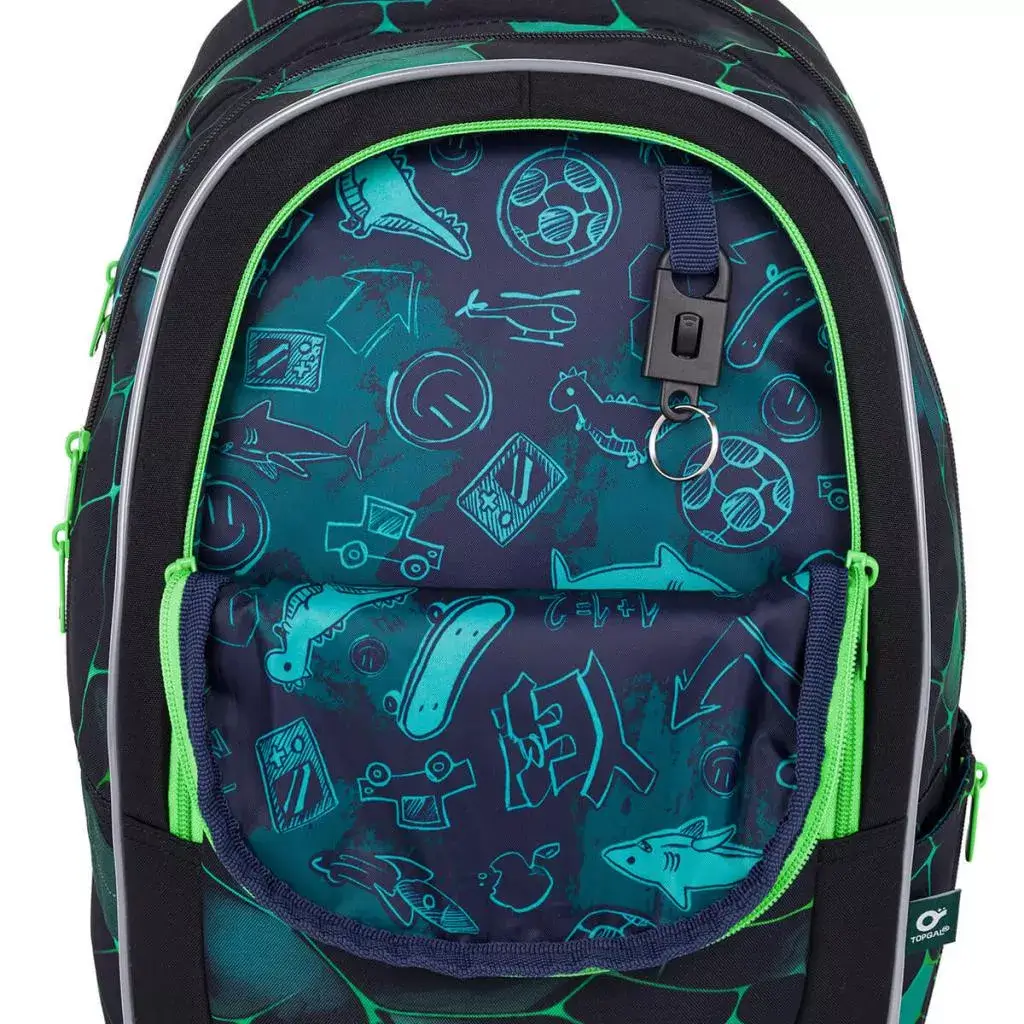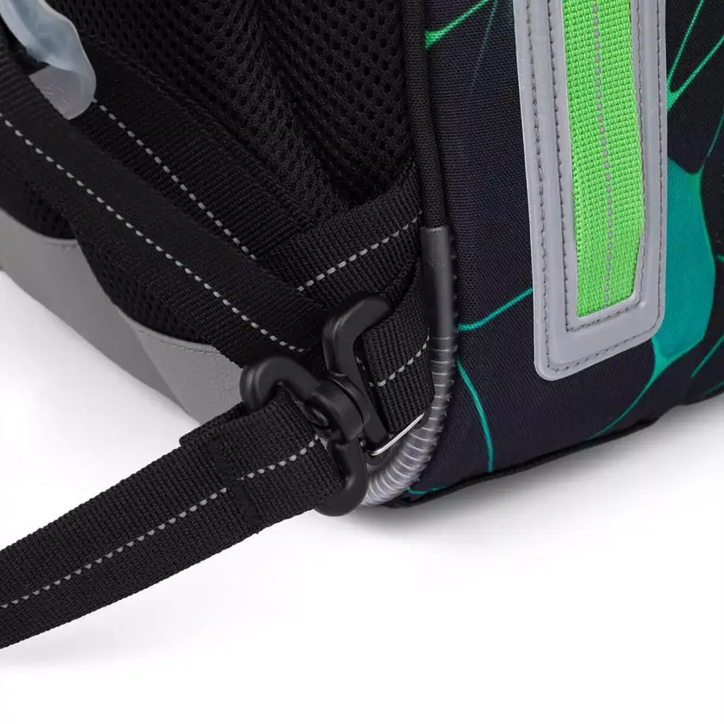- Další prvky: Nastavitelné ramenní popruhy, výškově nastavitelná hrudní přezka, odnímatelná karabina na klíče a poutko na zavěšení na lavici.