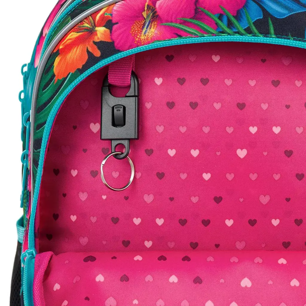 - Komory a kapsy: Dvě objemné hlavní komory a jedna hluboká přední kapsa. Přední kapsa obsahuje malou síťovou kapsu na zip a odnímatelnou karabinu na klíče.