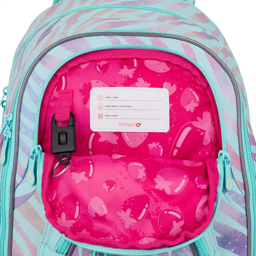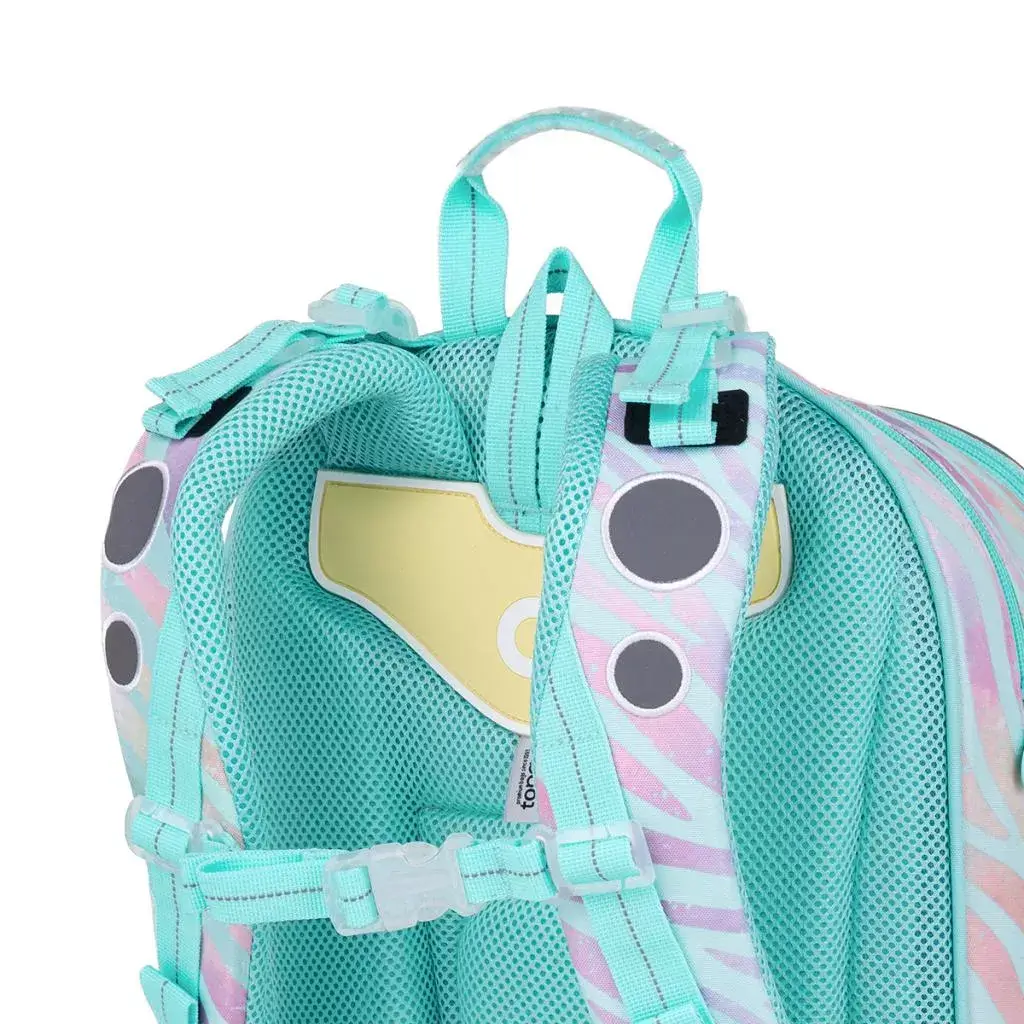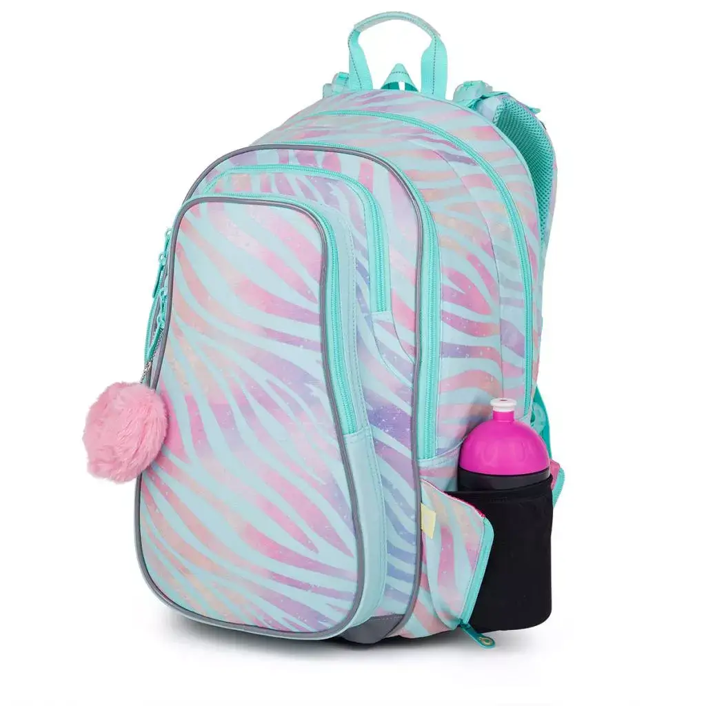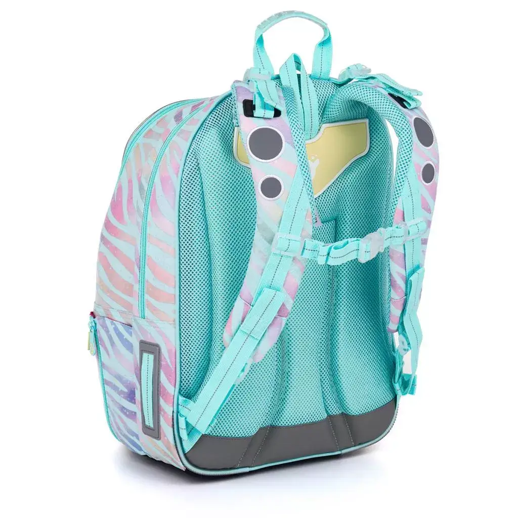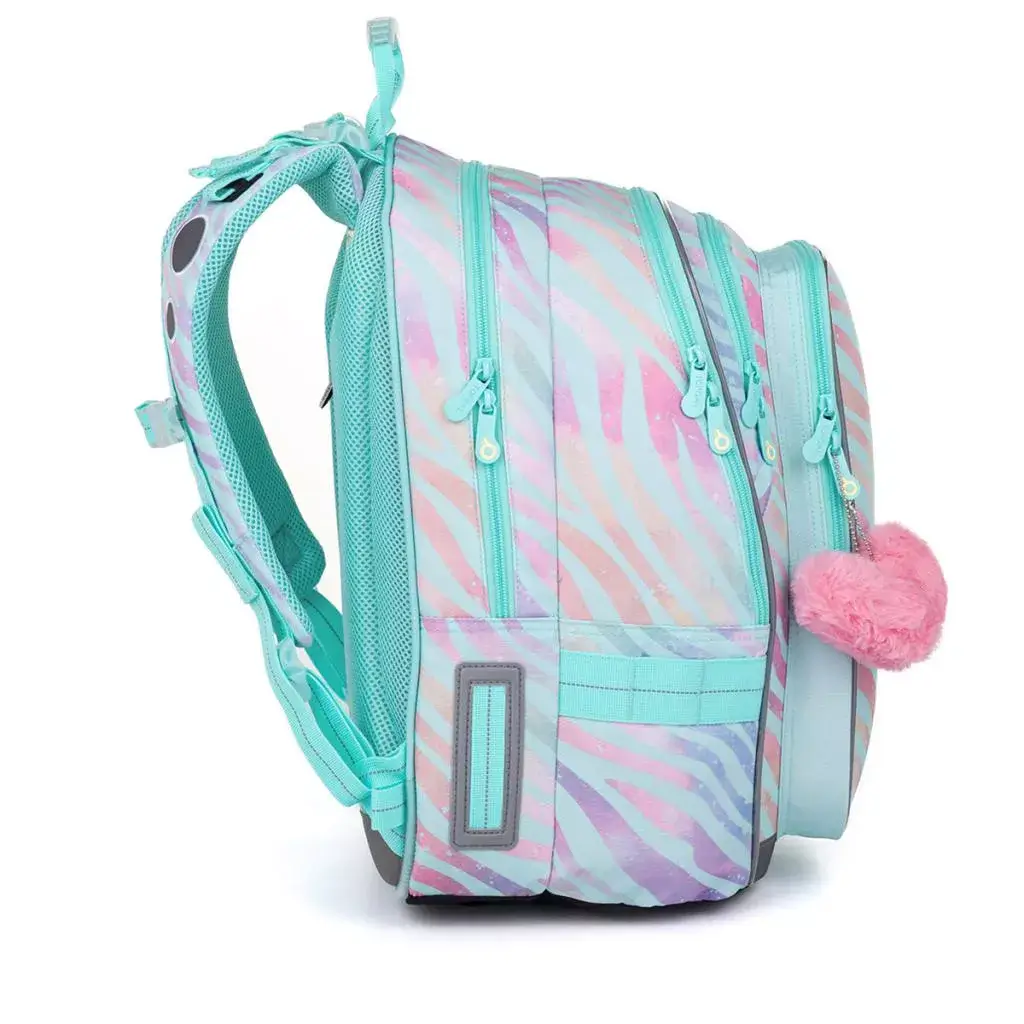 Topgal LYNN 25007 je objemný dvoukomorový školní batoh s designem duhové zebry pro dívky od 2. do 5. třídy ZŠ (od výšky 125 cm).