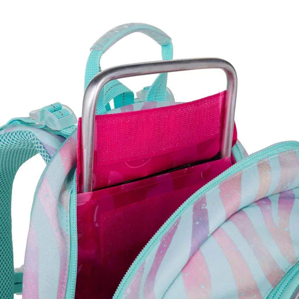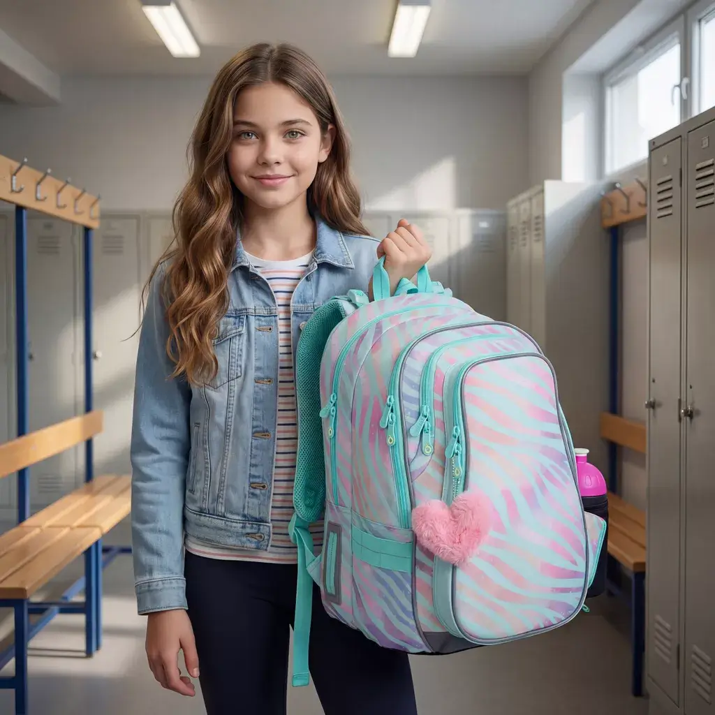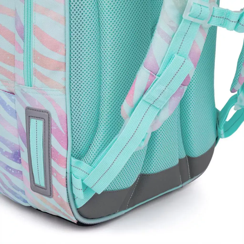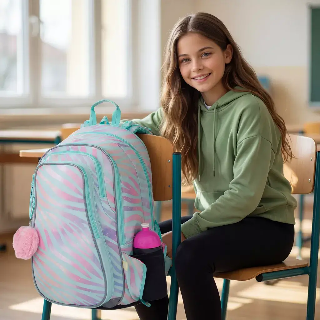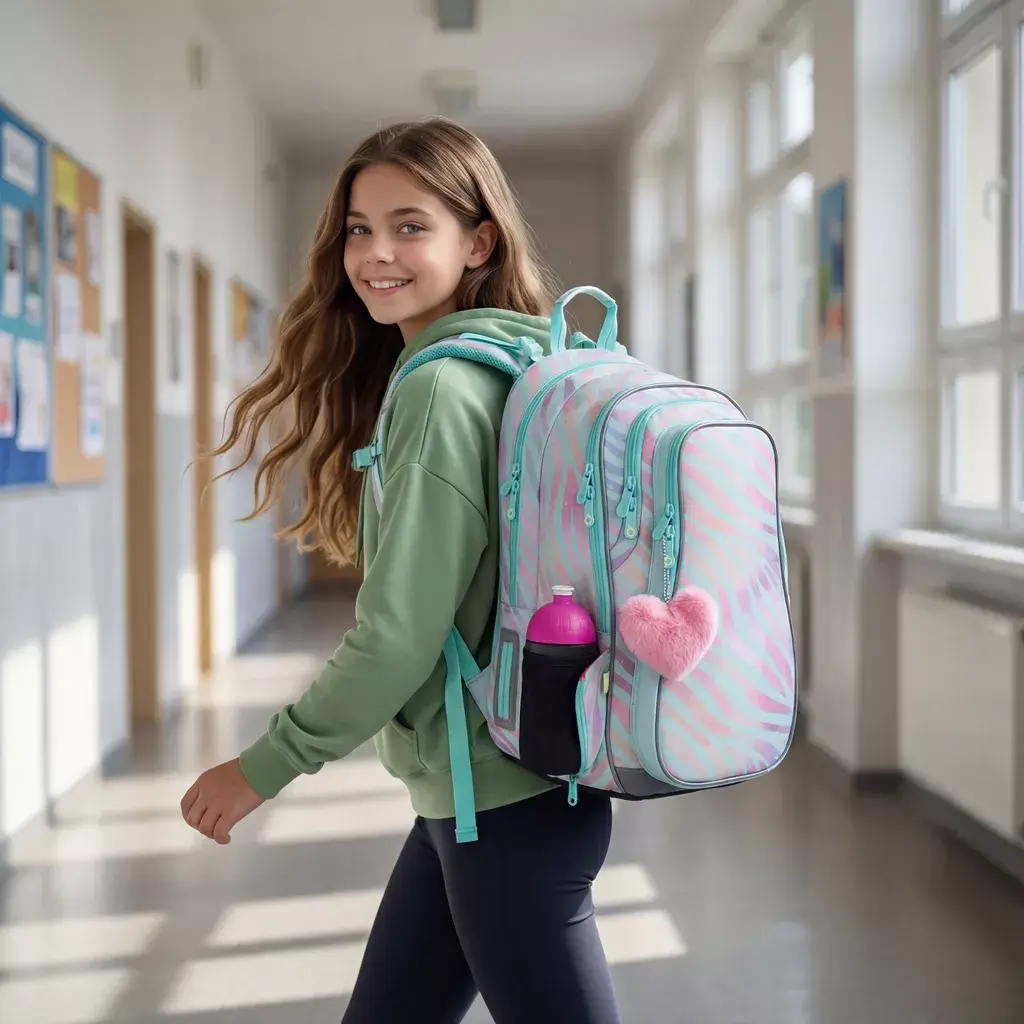 Topgal LYNN 25007 je objemný dvoukomorový školní batoh s designem duhové zebry pro dívky od 2. do 5. třídy ZŠ (od výšky 125 cm).