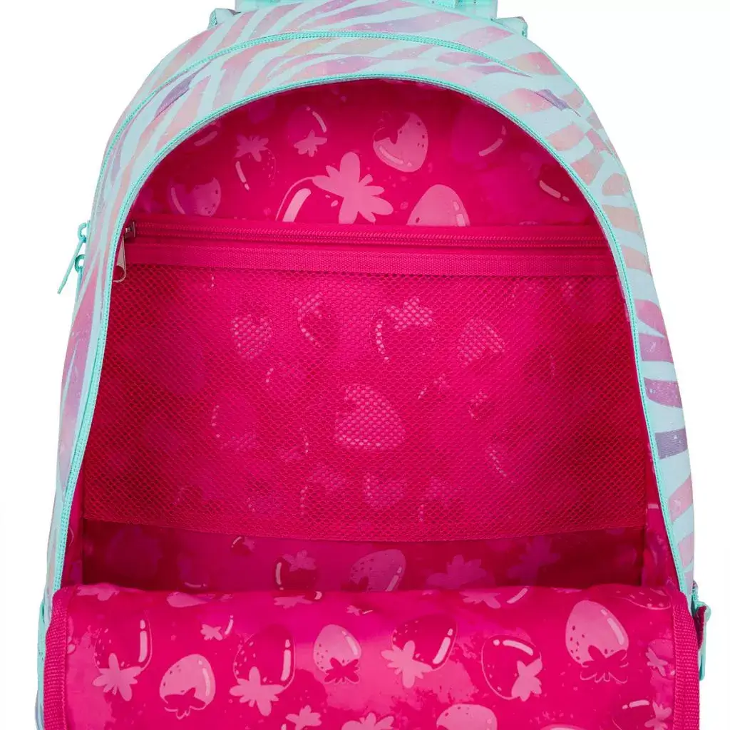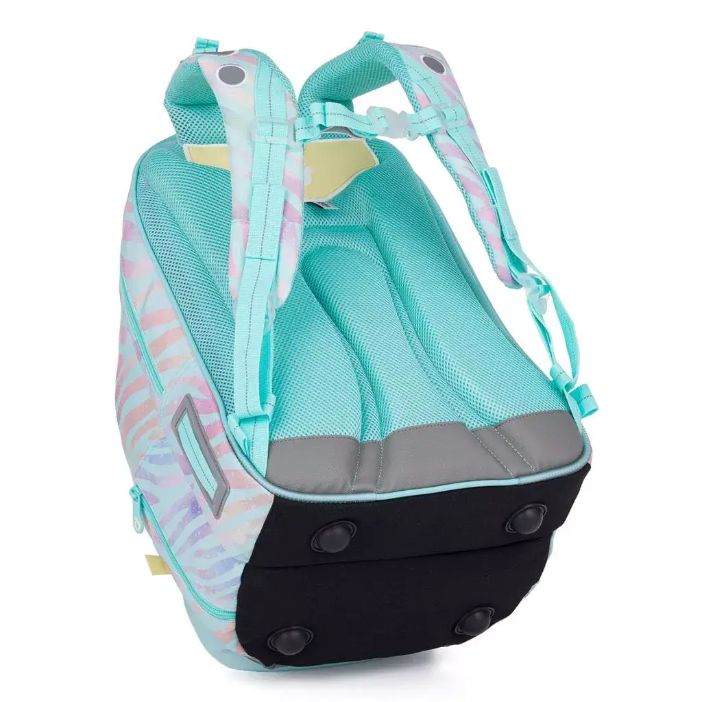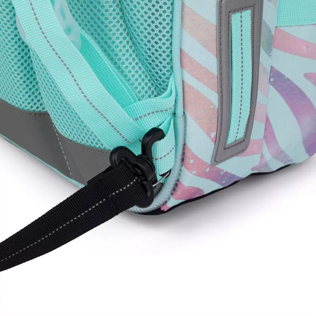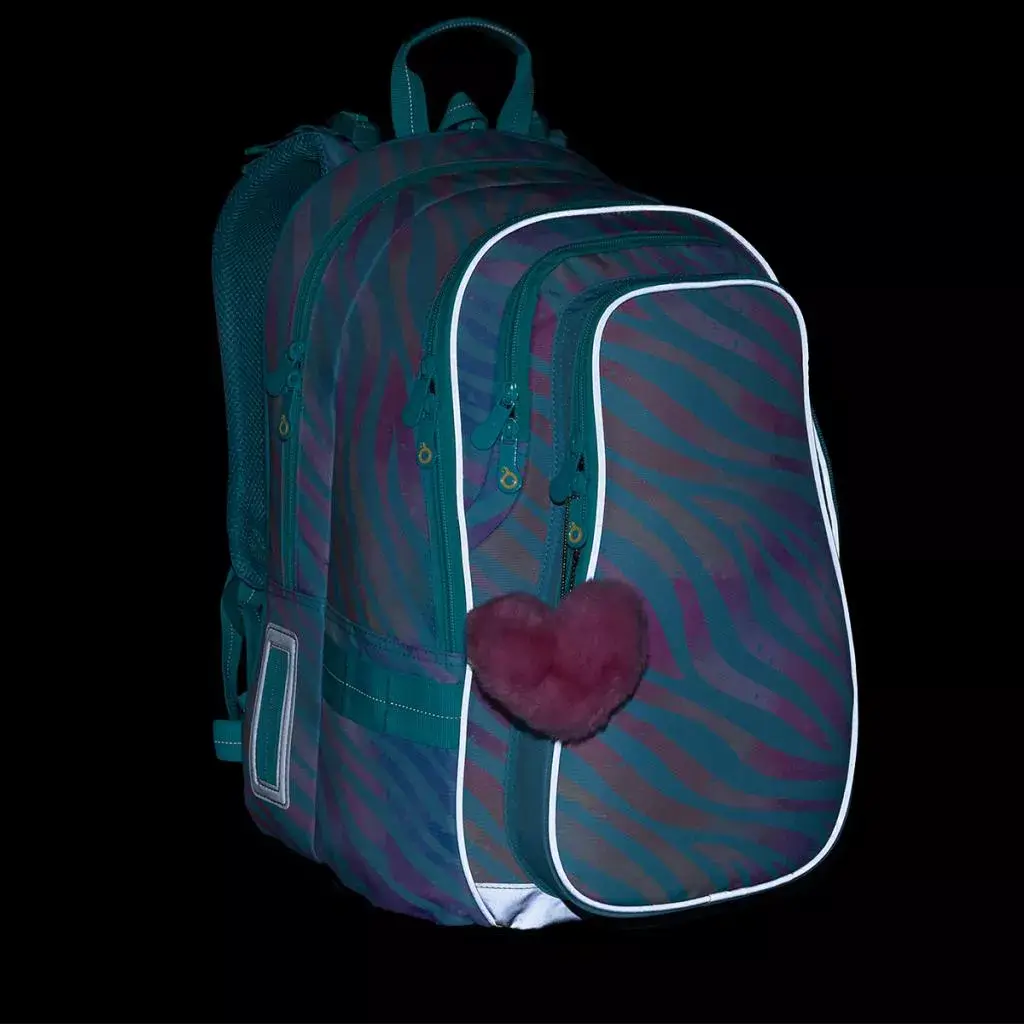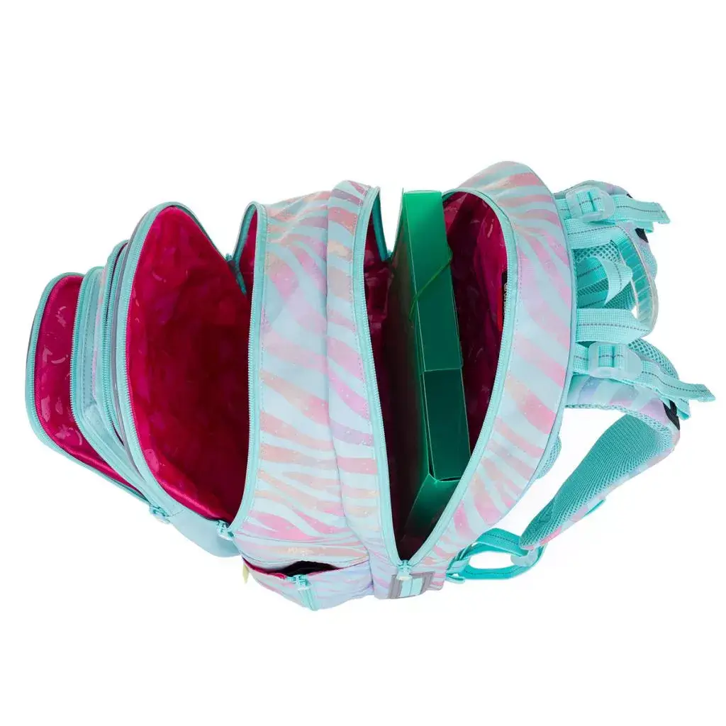 - Design: Tyrkysový batoh s barevným duhovým vzorem zebry a přívěskem ve tvaru srdce.