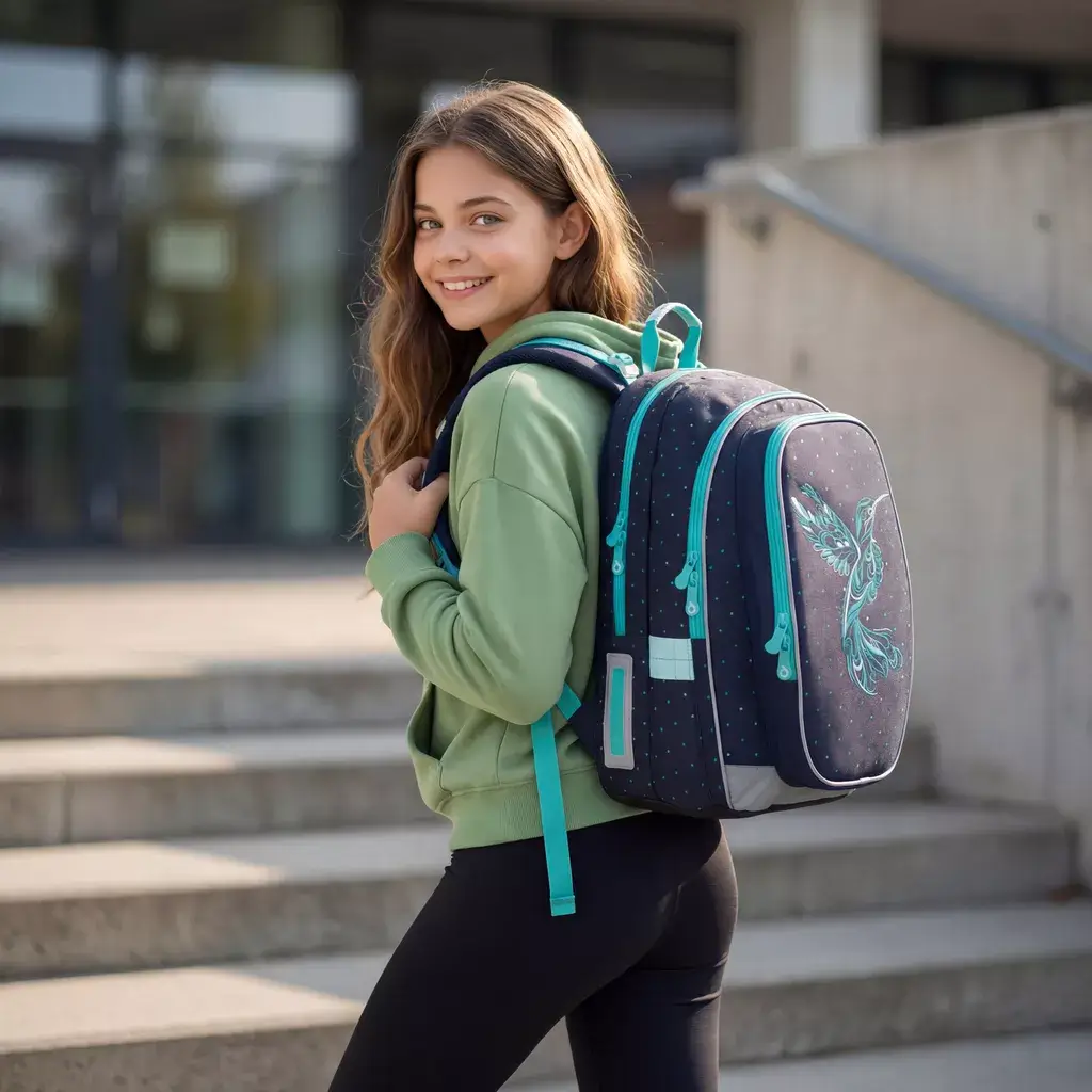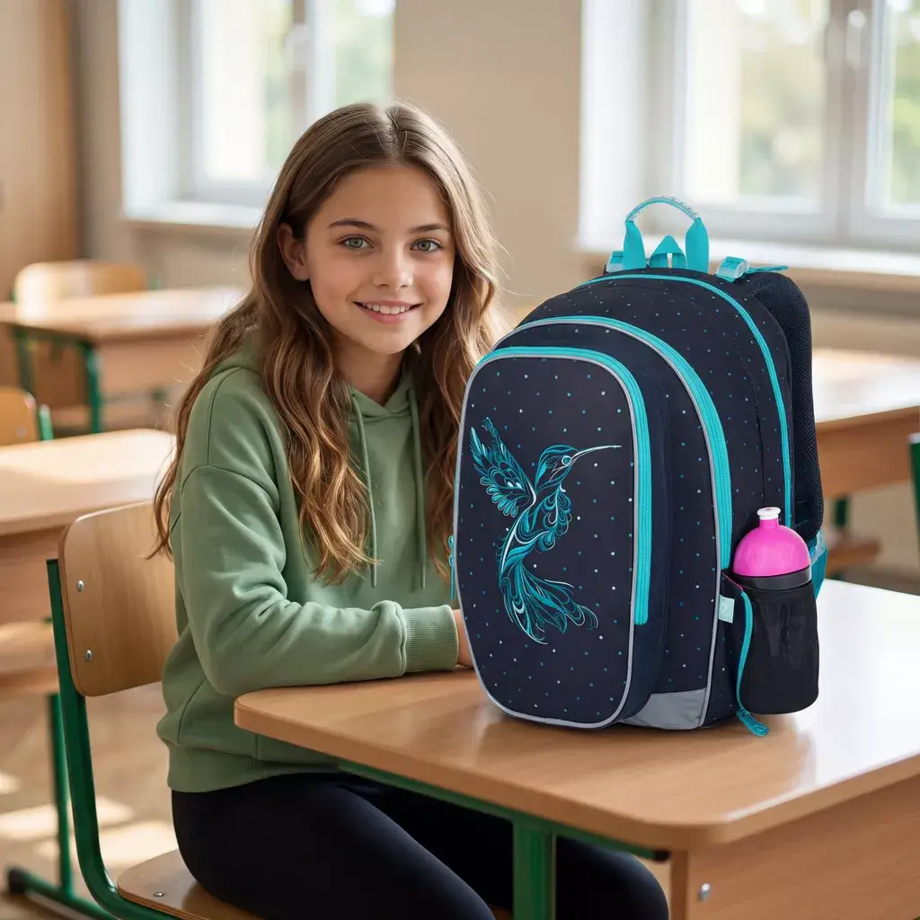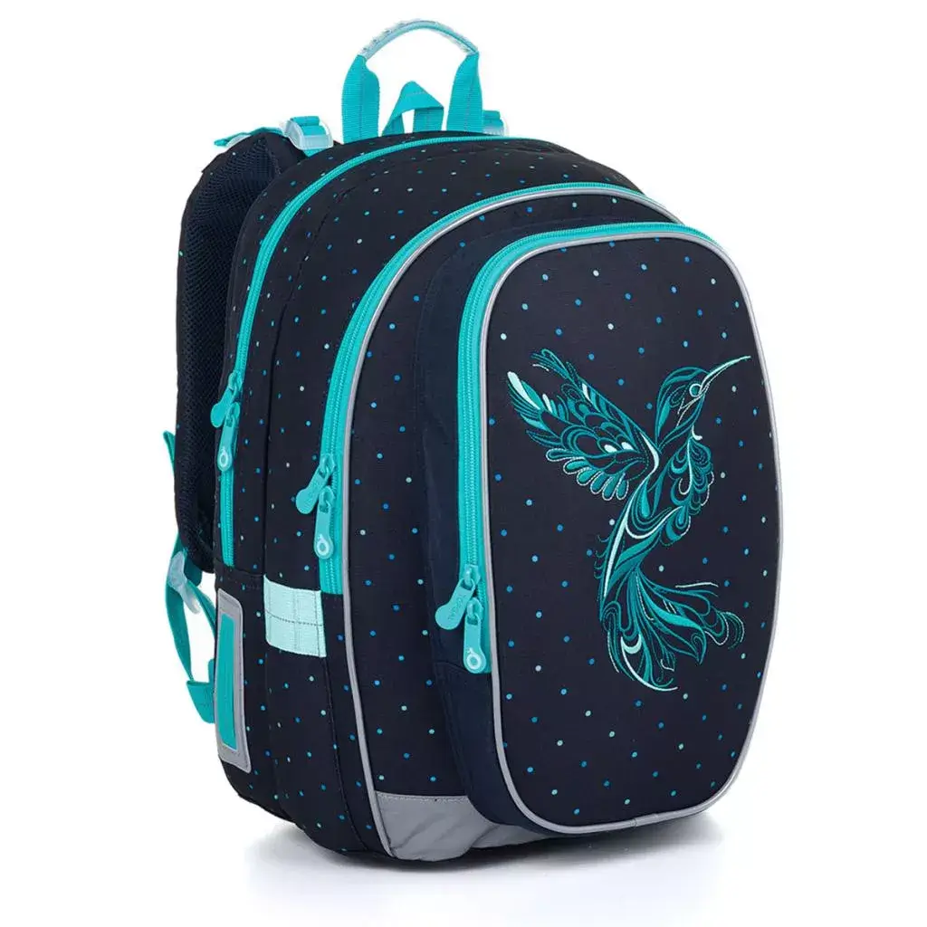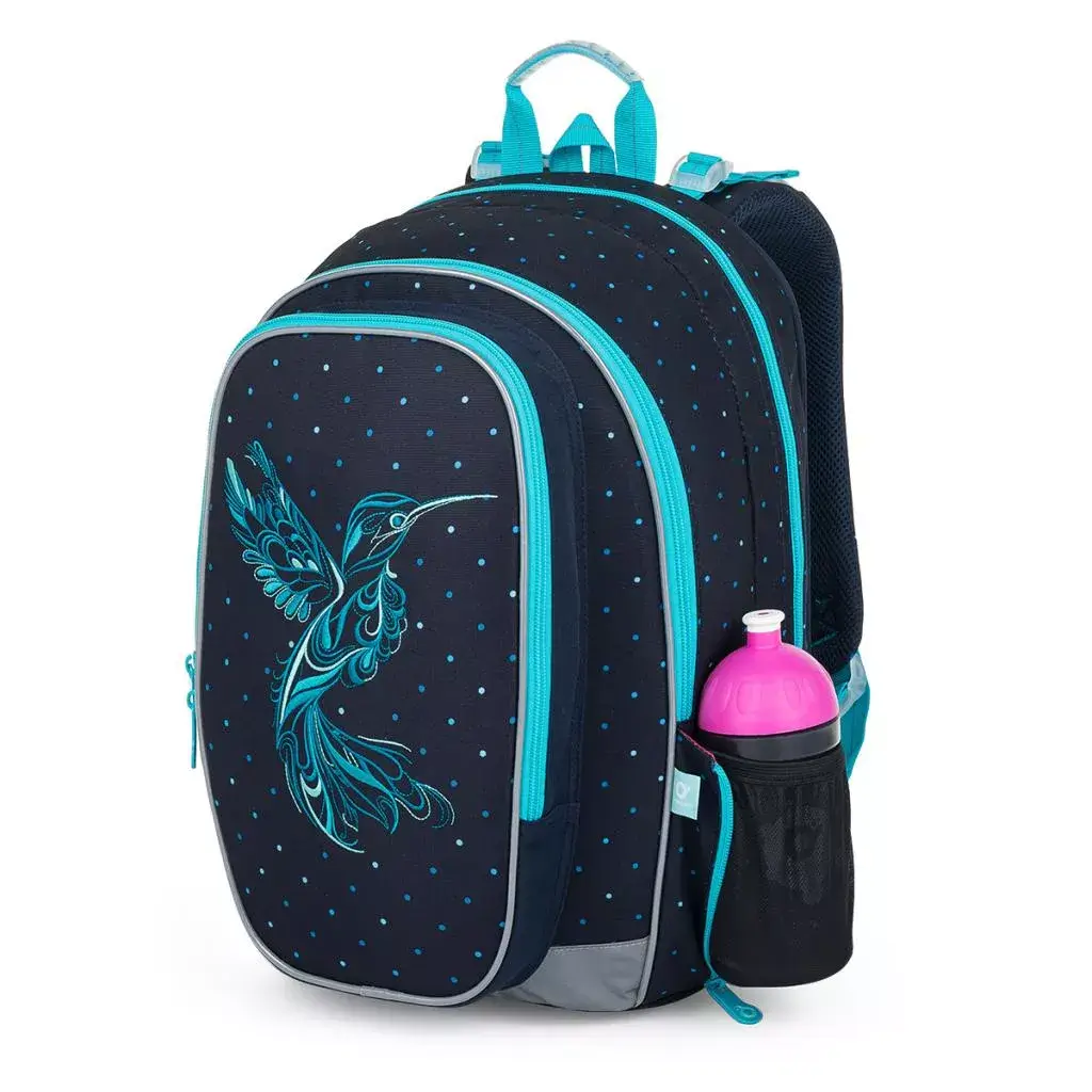 - Design: Tmavě modrá barva s tyrkysovými doplňky a výraznou výšivkou kolibříka.