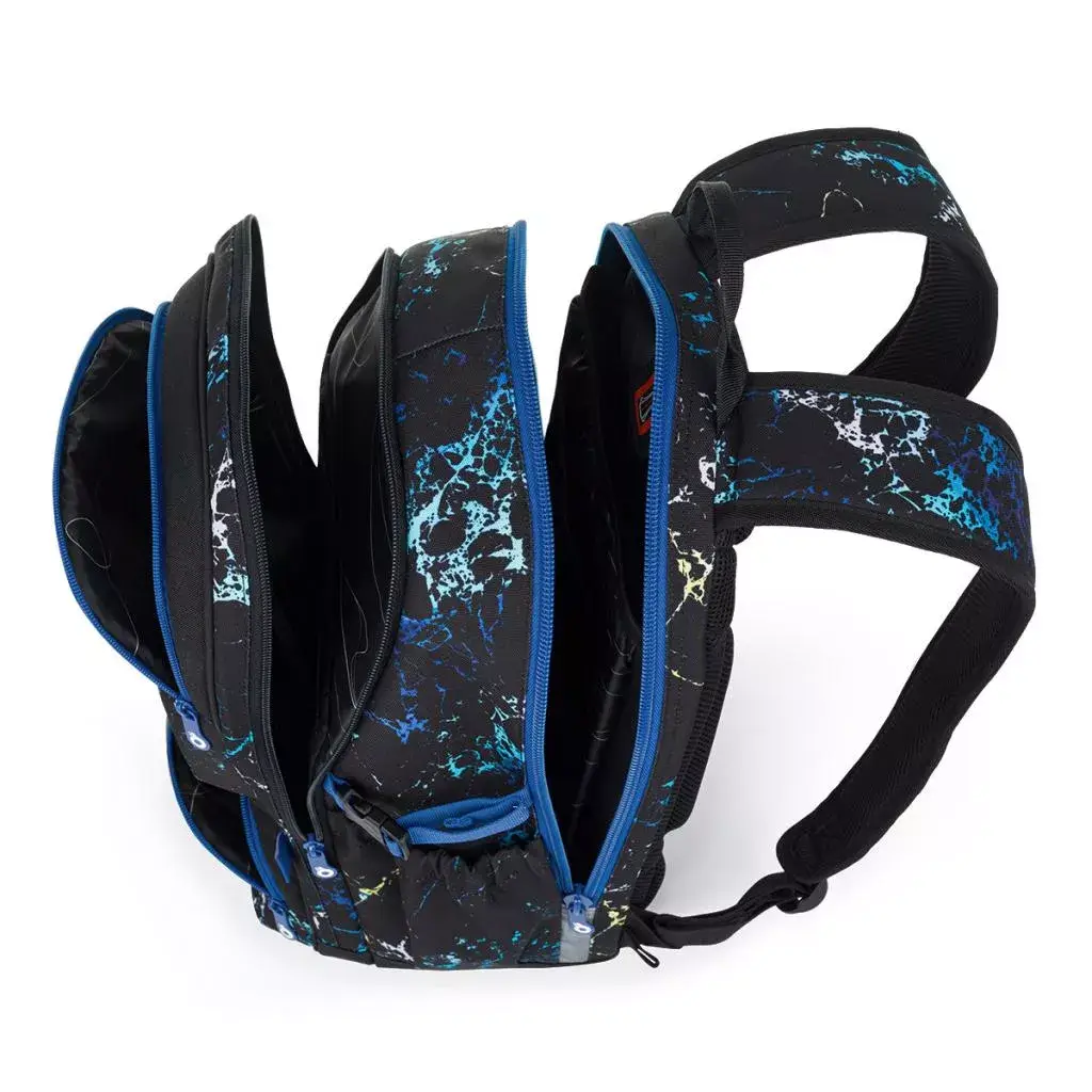 Kromě dvou hlavních komor má batoh dvě přední kapsy, do kterých se krásně pouzdro nebo svačinový box. Do prostřední komory je síťovaná kapsa na doklady a karabina na klíče. Postranní kapsy na lahev pojme 1,5 litrovou láhev.