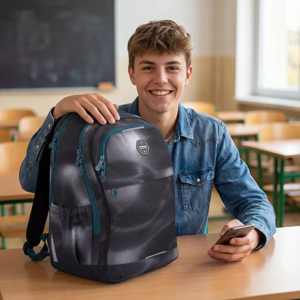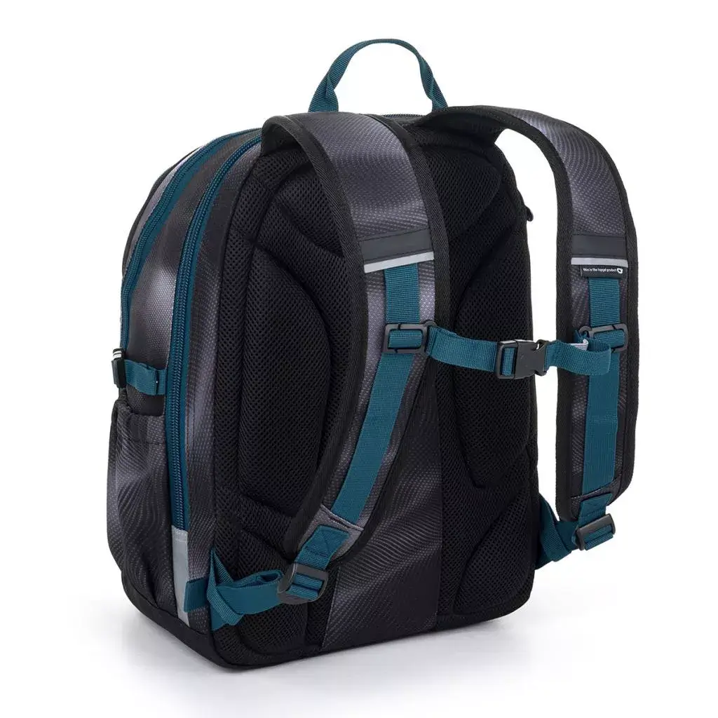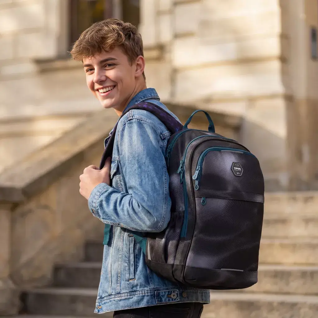 Objemný dvoukomorový studentský batoh Topgal RUBI 25034 v temně modré barvě s modrým žíháním je ideální volbou pro 2. stupeň ZŠ a SŠ. Záda batohu jsou polstrovaná, anatomicky tvarovaná a pevná díky lehké hliníkové výztuze. Uvnitř zadní komory je umístěna polstrovaná kapsa na notebook/tablet a druhá menší na mobil či powerbanku.