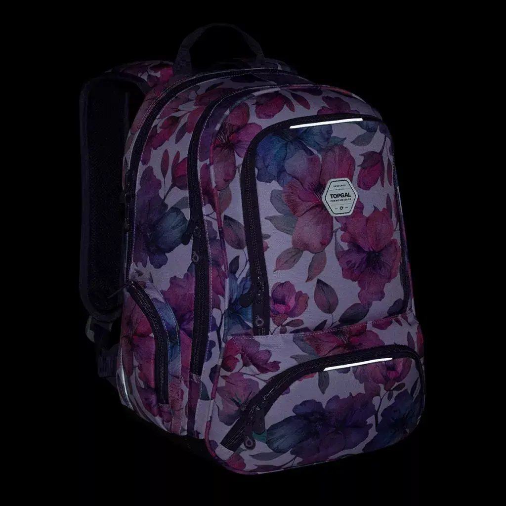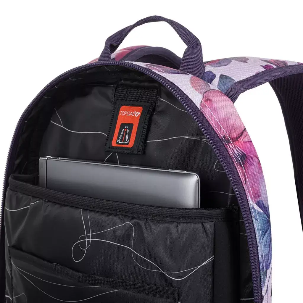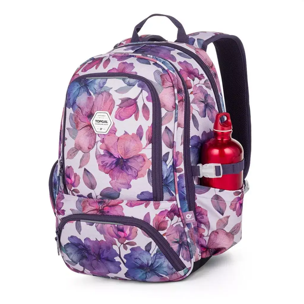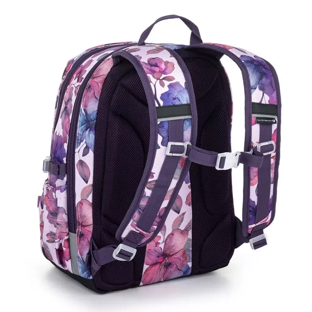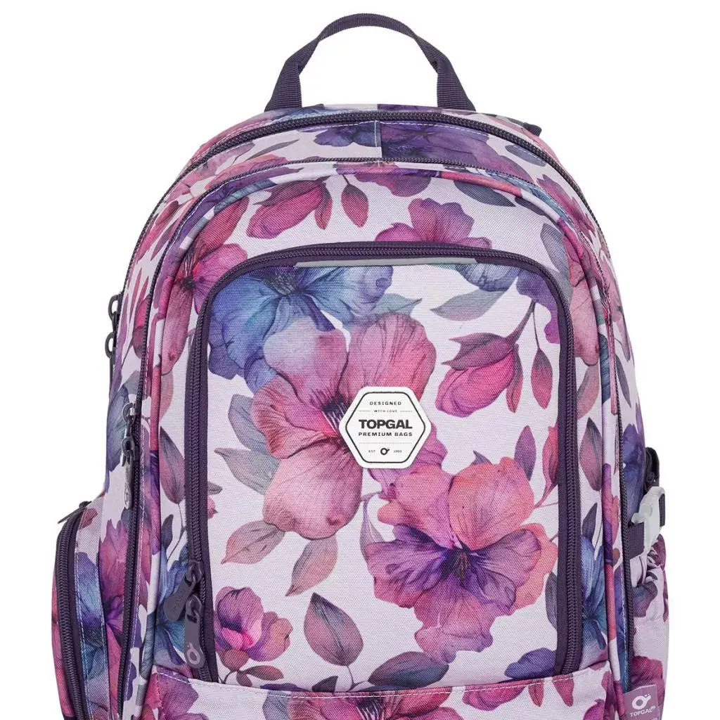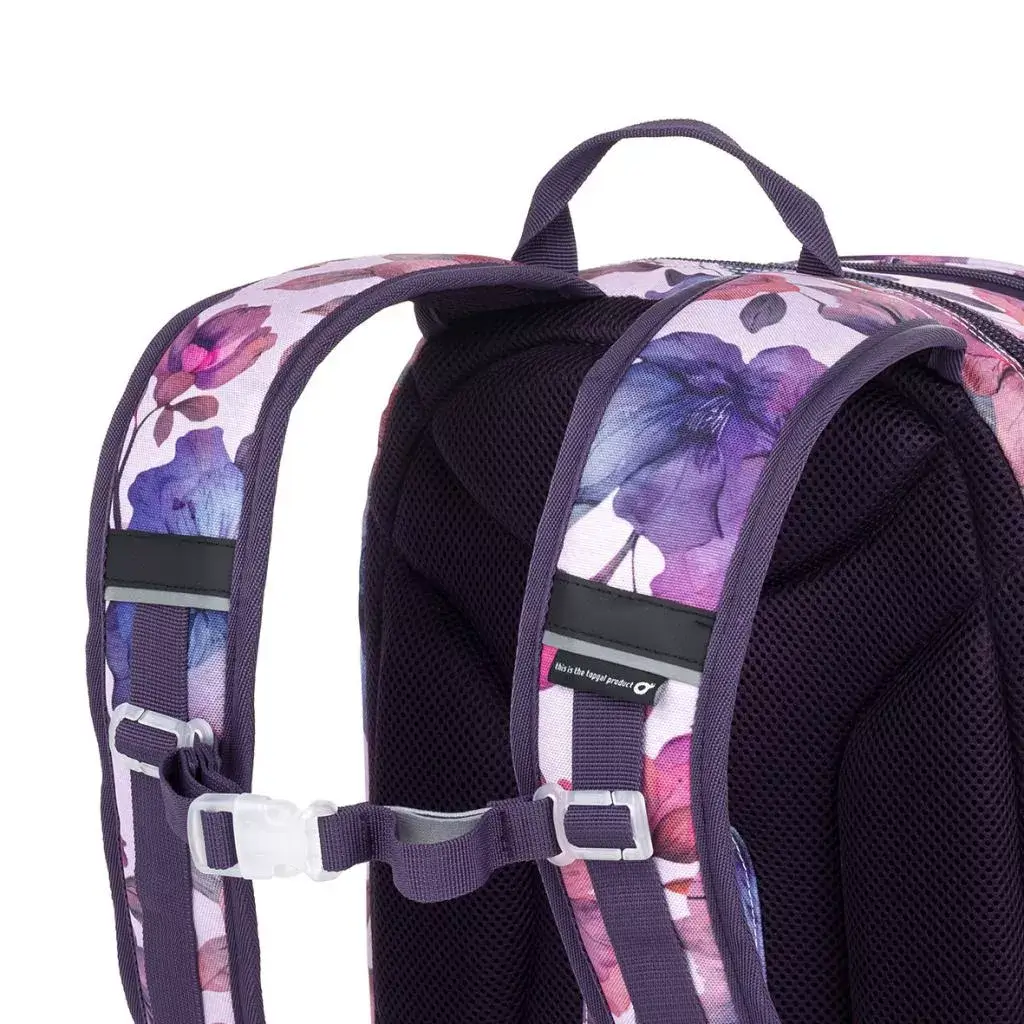 Dvoukomorový studentský batoh Topgal SURI 25028 s barevnými květy a stylovou nášivkou je ideální volbou pro 2. stupeň ZŠ a SŠ. Záda batohu jsou polstrovaná, anatomicky tvarovaná s lehkou hliníkovou výztuhou. Uvnitř zadní komory je umístěna polstrovaná kapsa na notebook a menší na tablet či powerbanku, v druhé komoře najdete klíčenku síťovanou kapsu na zip.