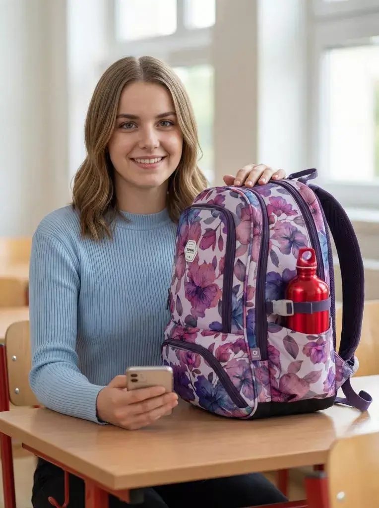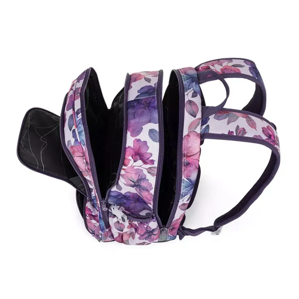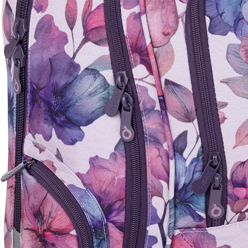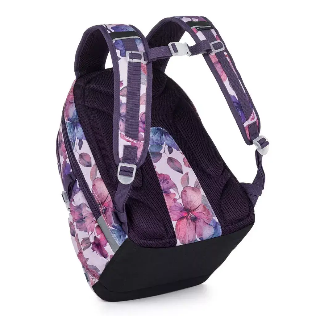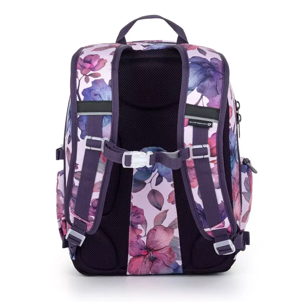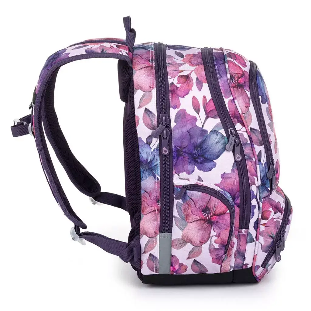 Dvoukomorový studentský batoh Topgal SURI 25028 s barevnými květy a stylovou nášivkou je ideální volbou pro 2. stupeň ZŠ a SŠ. Záda batohu jsou polstrovaná, anatomicky tvarovaná s lehkou hliníkovou výztuhou. Uvnitř zadní komory je umístěna polstrovaná kapsa na notebook a menší na tablet či powerbanku, v druhé komoře najdete klíčenku síťovanou kapsu na zip.